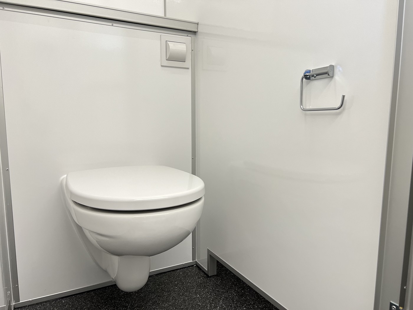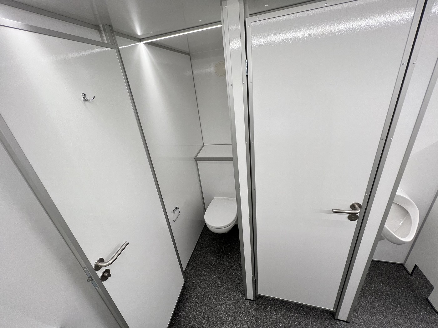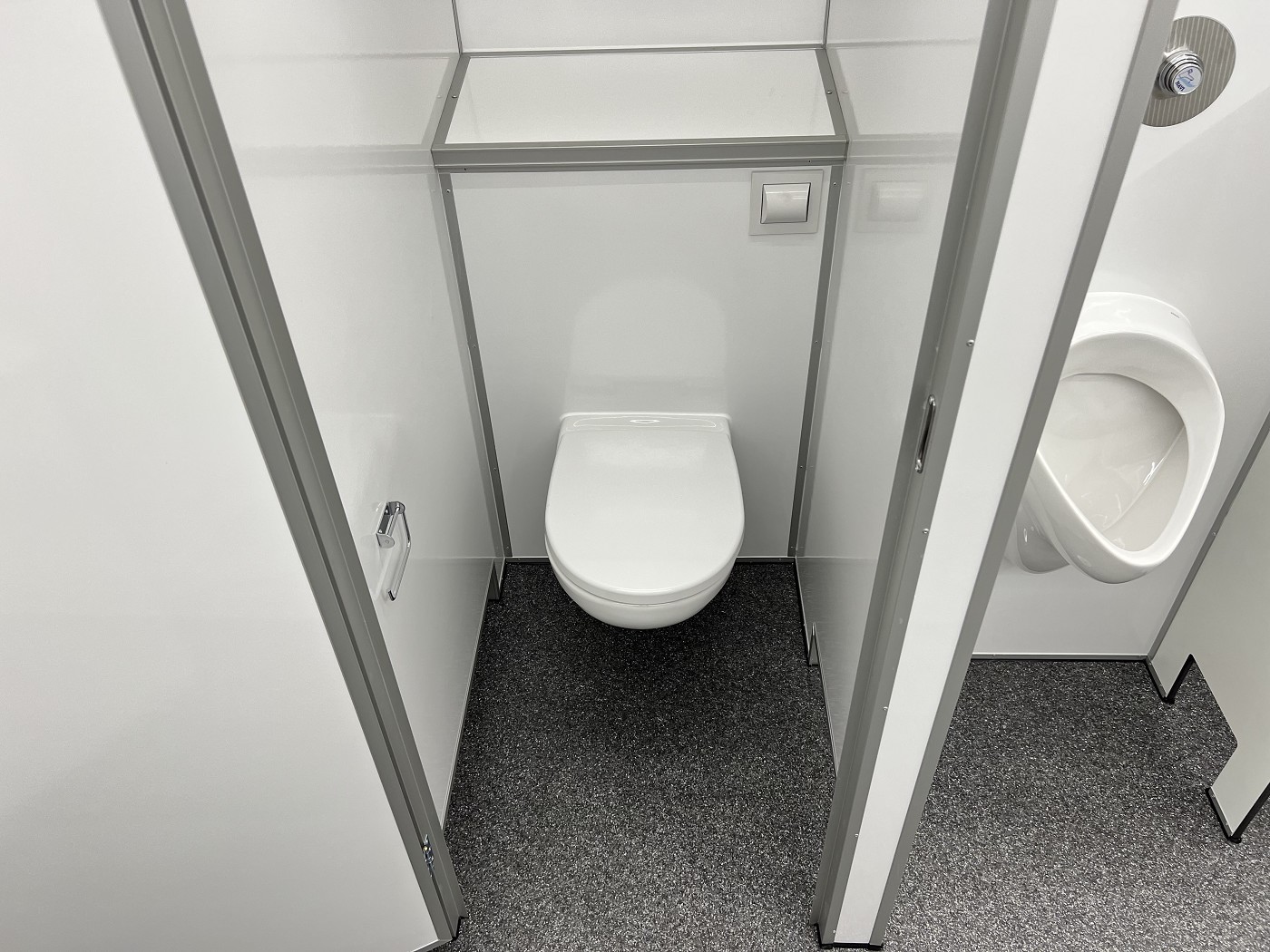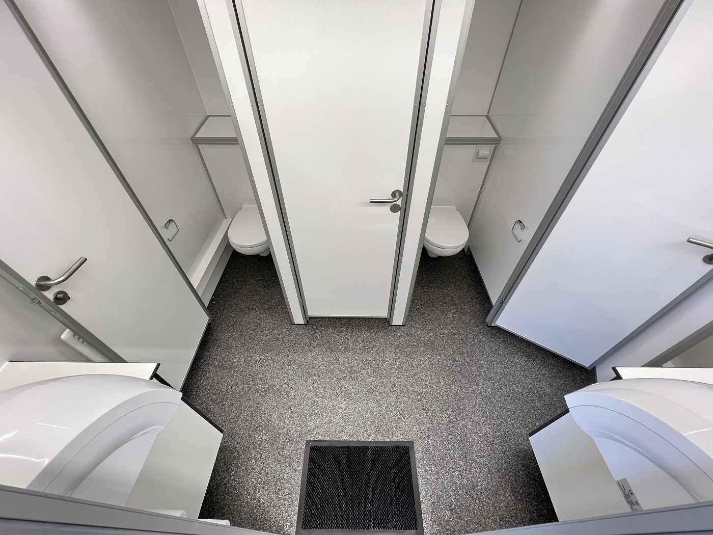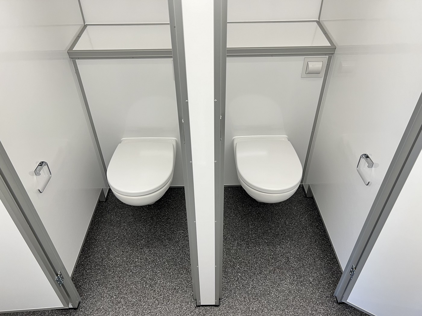 • 2 WC-Kabinen mit wasserspülender, wandaufgehängter Toilette