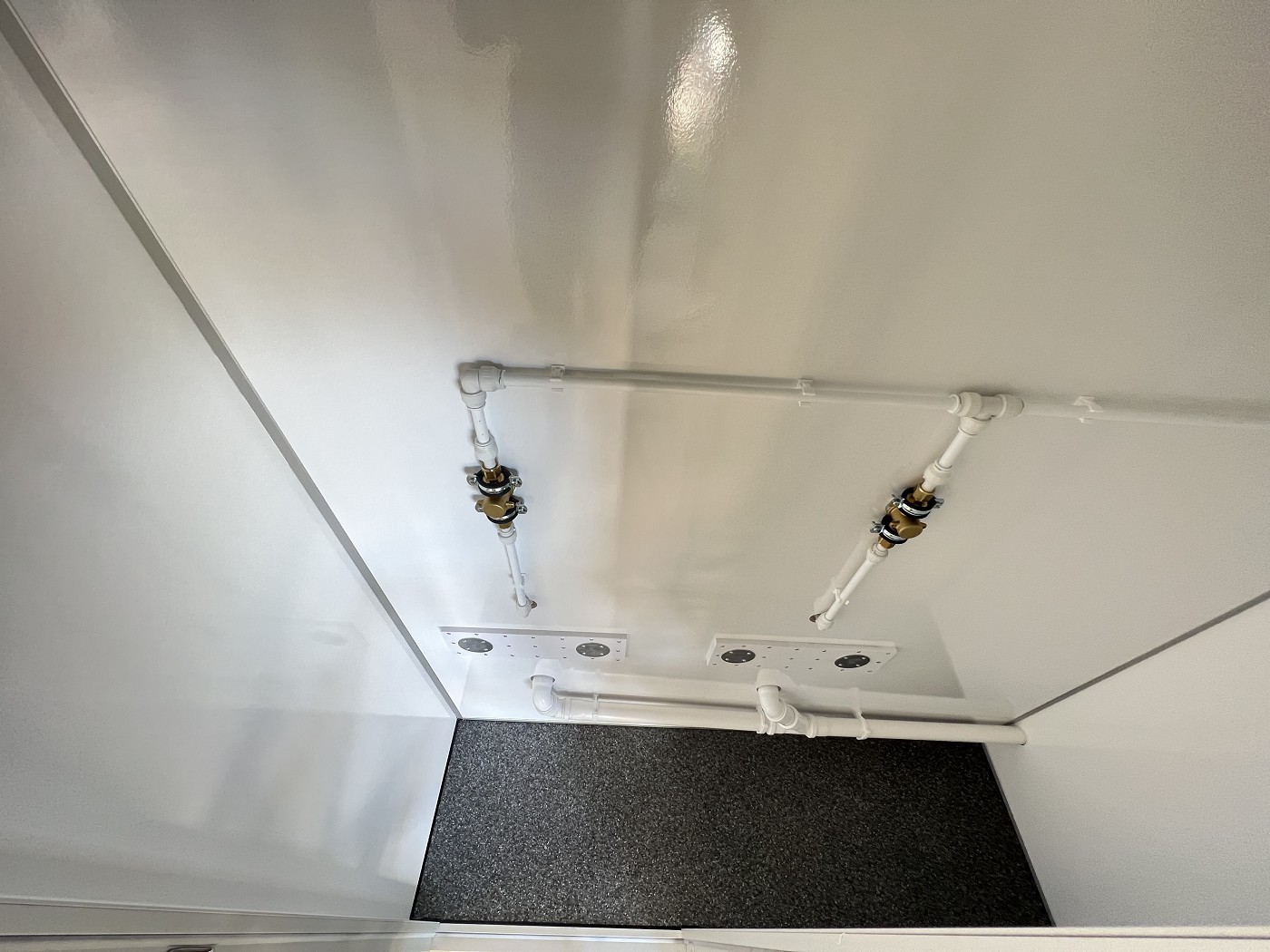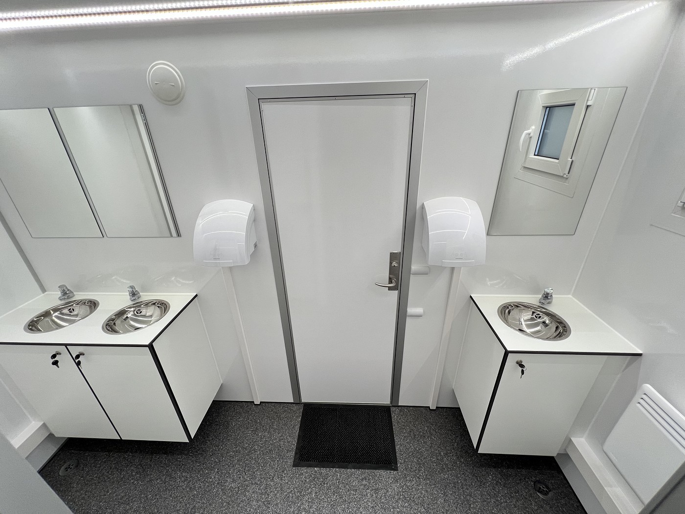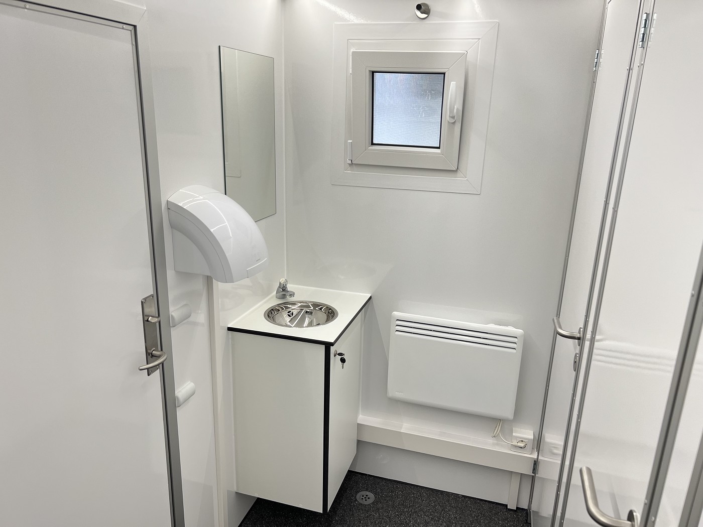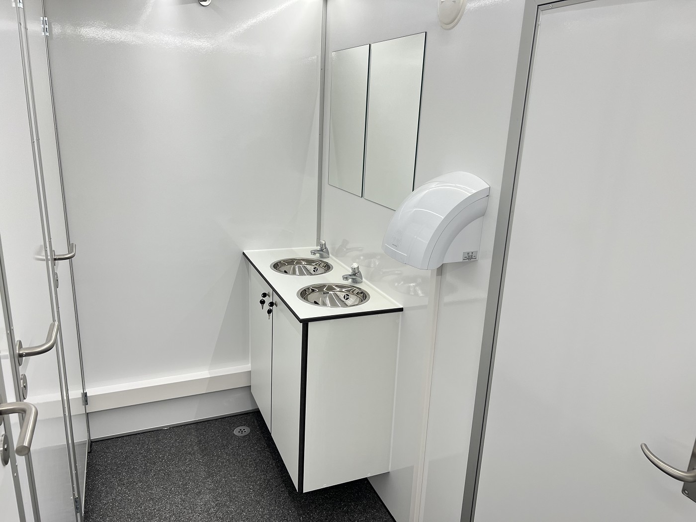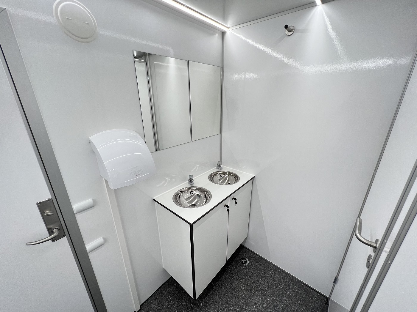 • 2 WC-Kabinen mit wasserspülender, wandaufgehängter Toilette