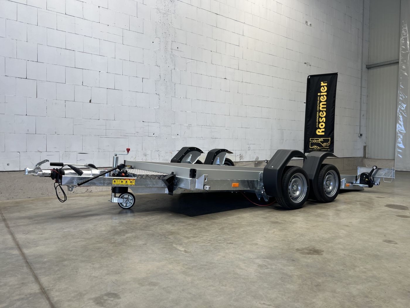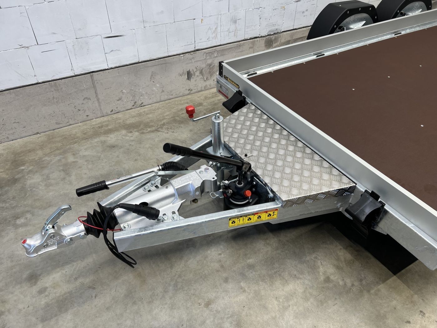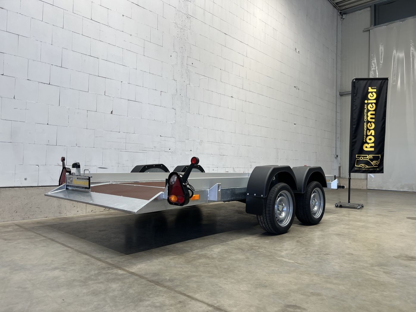 Absenkbarer Universaltransporter ideal zum Transportieren von Scherenbühnen, Motorrädern und anderen Fahrzeugen. Ermöglicht ebenfalls ein einfaches Verladen von Palettenware mittels Hubwagen.