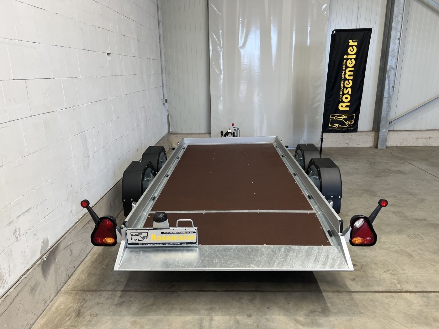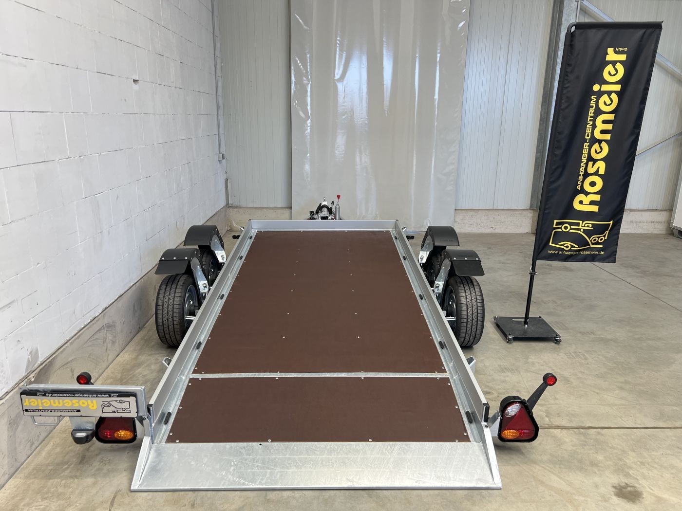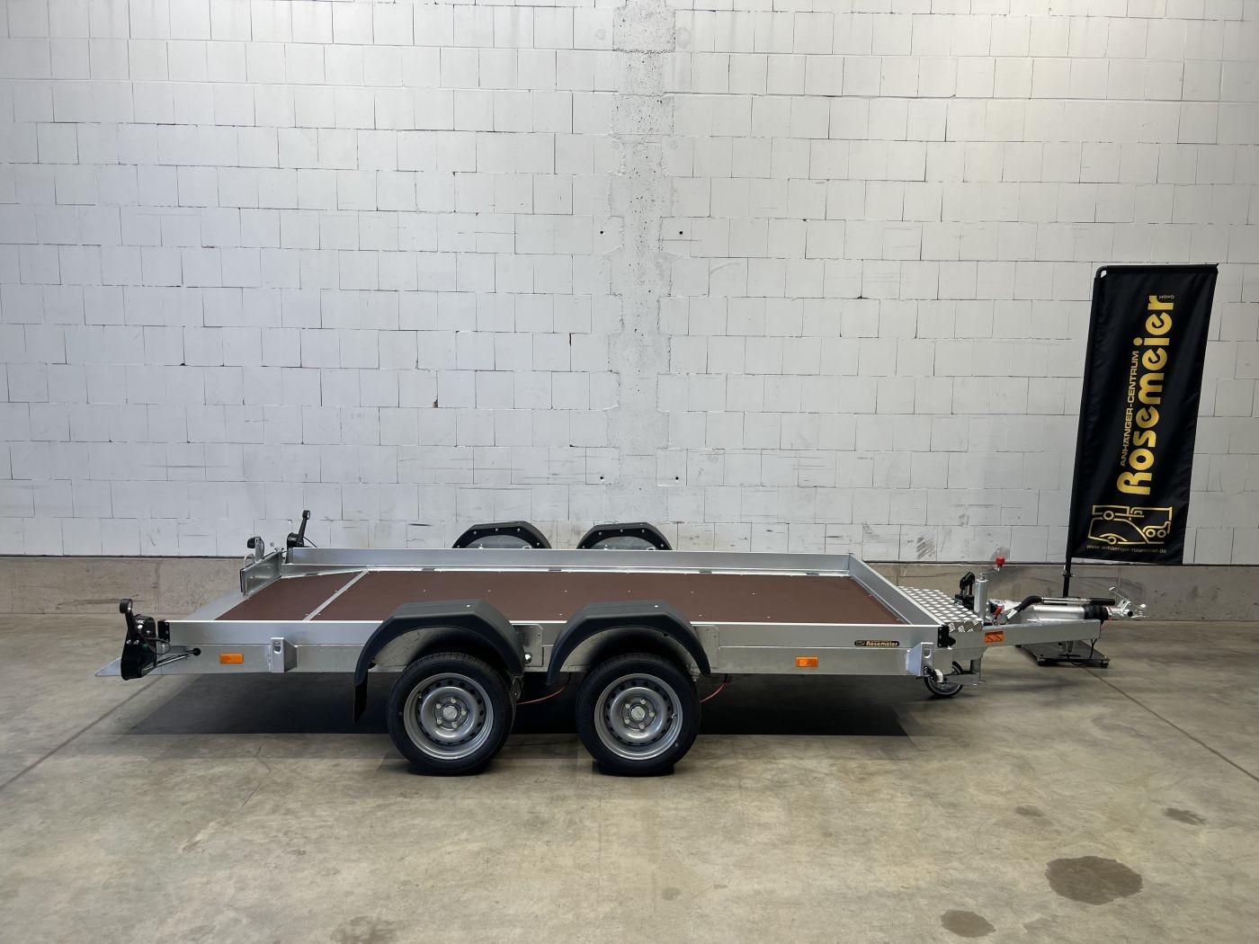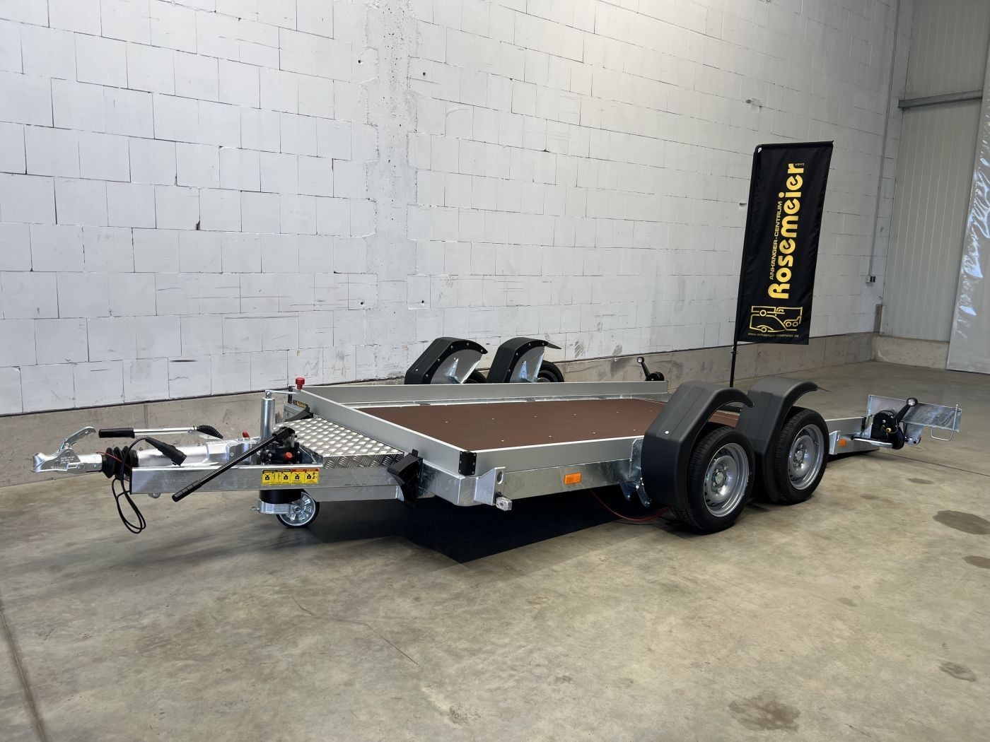 Absenkbarer Universaltransporter ideal zum Transportieren von Scherenbühnen, Motorrädern und anderen Fahrzeugen. Ermöglicht ebenfalls ein einfaches Verladen von Palettenware mittels Hubwagen.